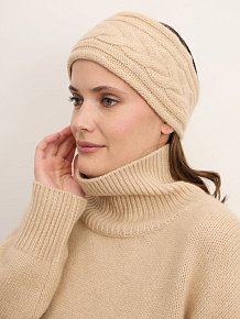 Повязка выполнена из мягкого кашемирового трикотажа с рельефным плетёным узором. Эластичная структура обеспечивает комфортную посадку и защиту от ветра, не сдавливая голову. Нежный бежевый оттенок подчёркивает природную теплоту кашемира и делает изделие универсальным для любого гардероба.