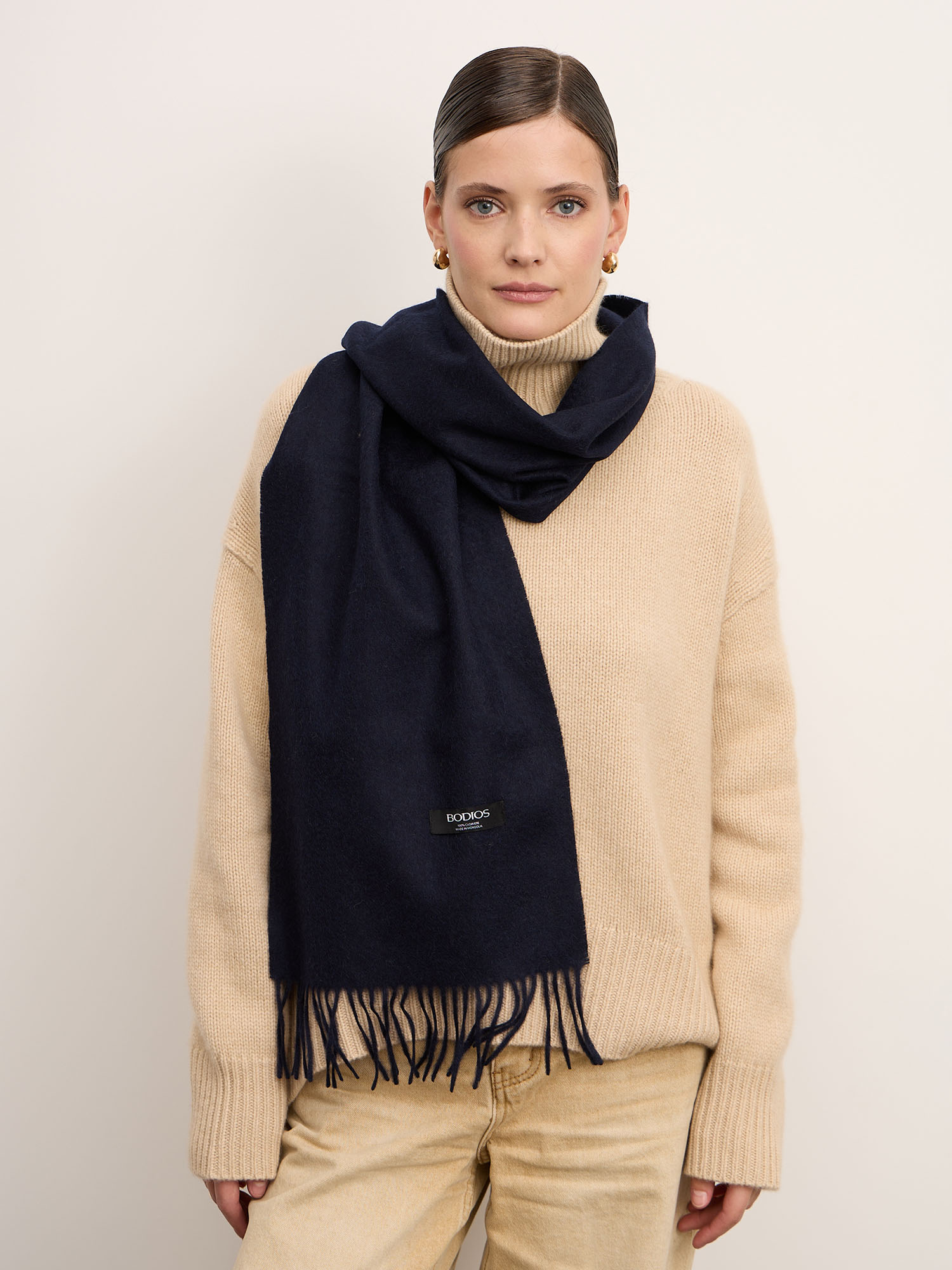 Классический прямоугольный формат позволяет носить шарф различными способами: свободно на плечах, обернув вокруг шеи или создавая многослойные образы. Минималистичный дизайн подчёркивает благородство натурального материала. Края изделия украшены аккуратной бахромой.