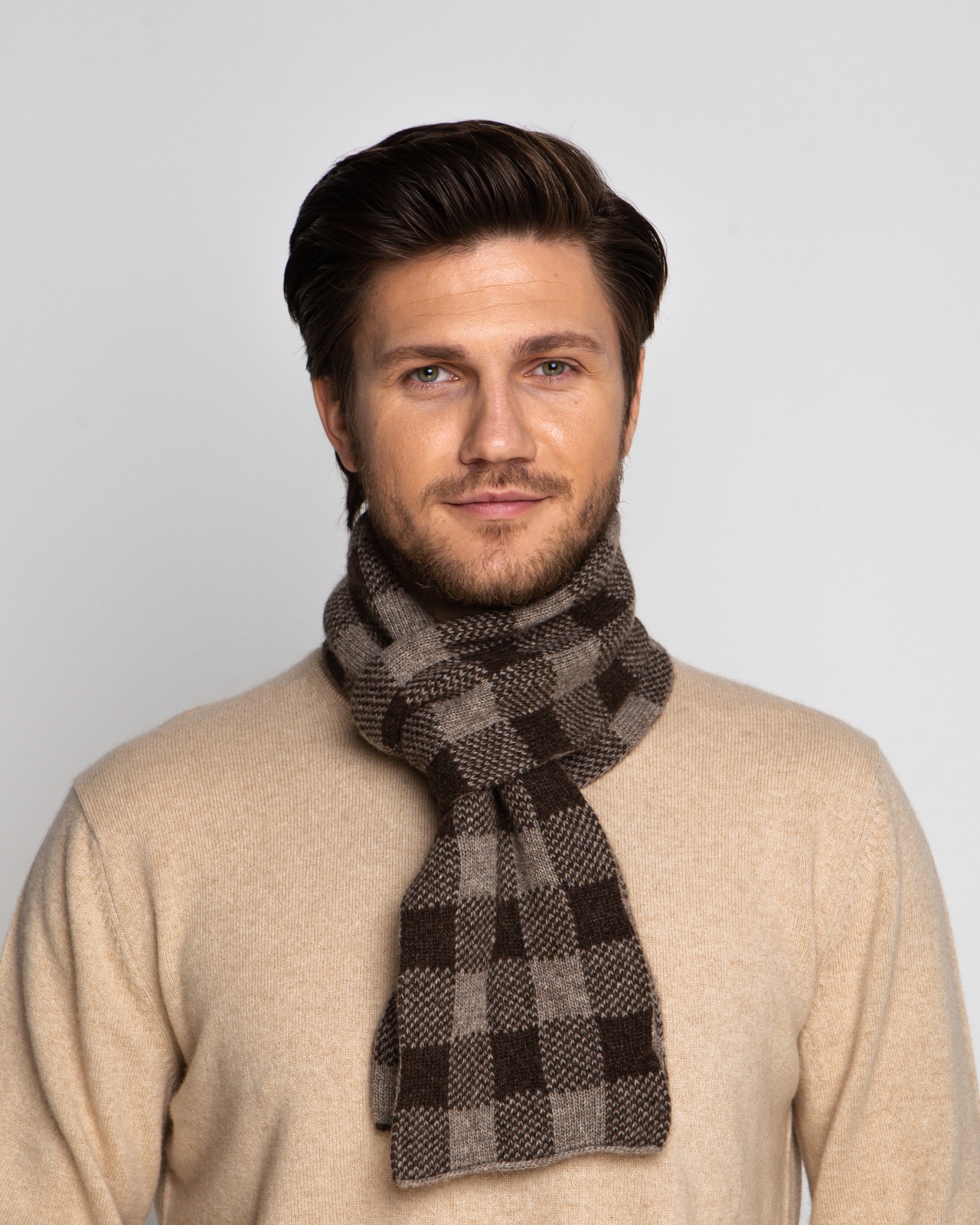 Сочетание коричневых и бежевых оттенков в клетчатом рисунке. Гармоничная природная палитра легко сочетается с базовыми цветами гардероба и подчеркивает элегантность образа.