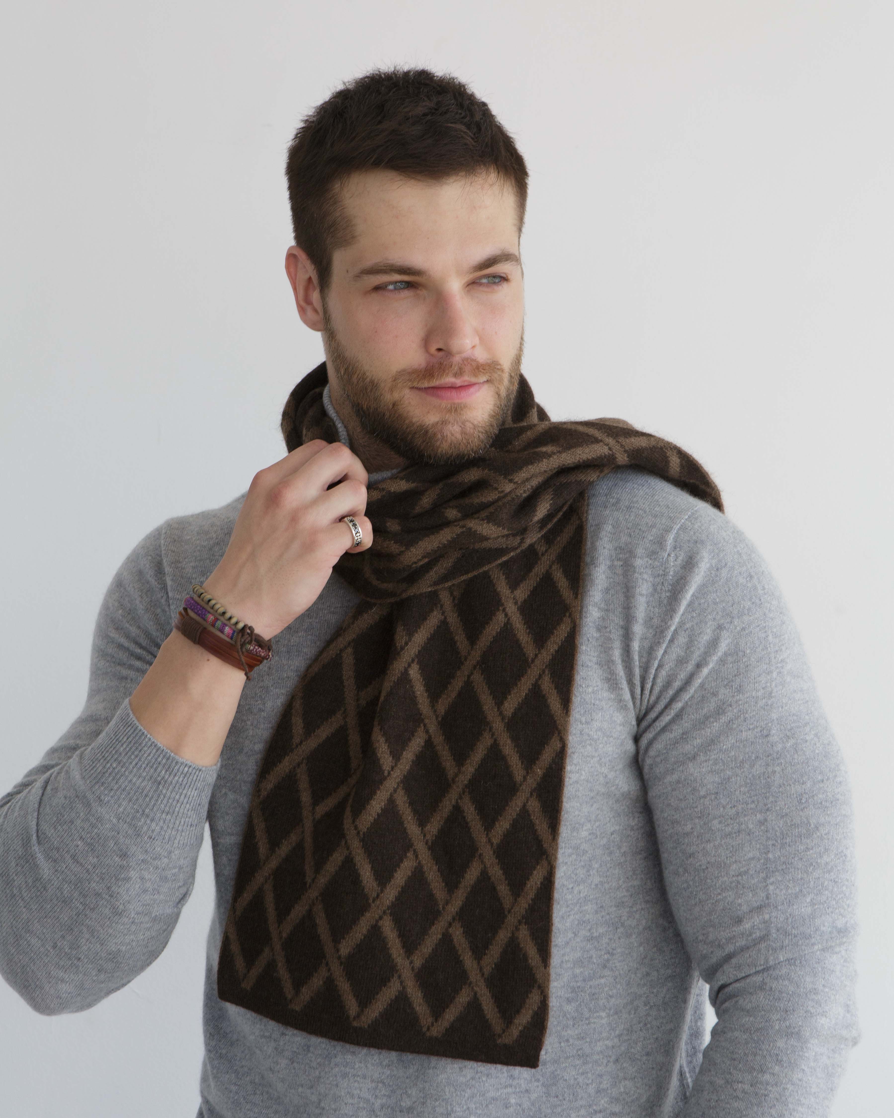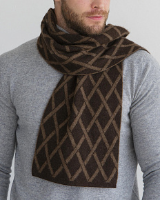 Классическая прямоугольная форма с контрастным геометрическим ромбовидным узором. Двухцветная вязка создаёт выразительный рисунок и подчёркивает текстуру изделия. Минималистичная отделка делает шарф стильным и современным аксессуаром.