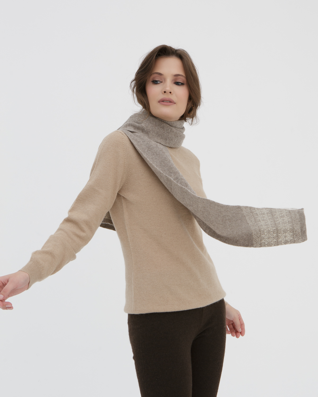 Классическая прямоугольная форма с аккуратной вязкой и декоративной полосой по краям. Минималистичный дизайн позволяет легко комбинировать аксессуар с верхней одеждой, пальто, жакетами и свитерами.