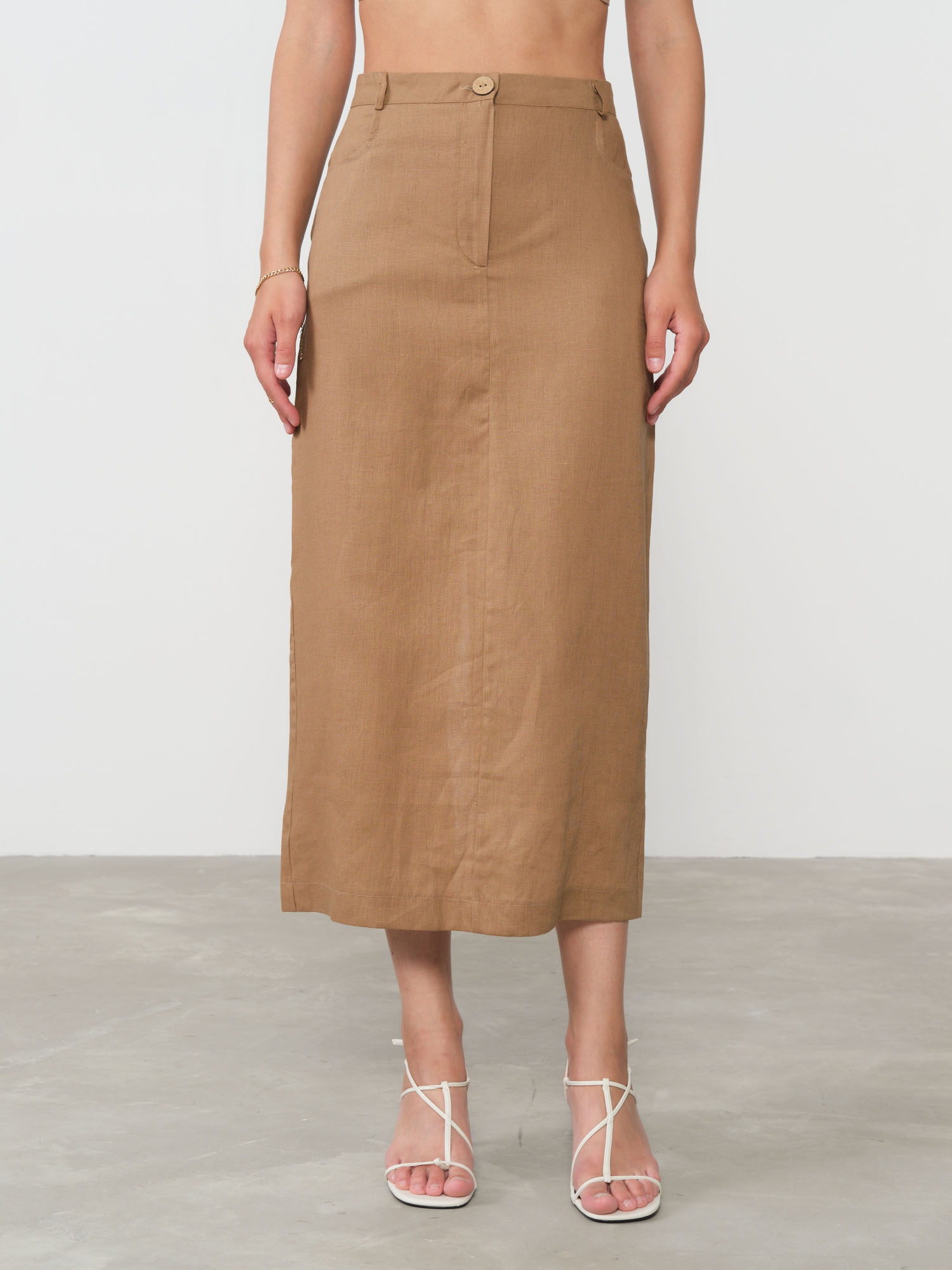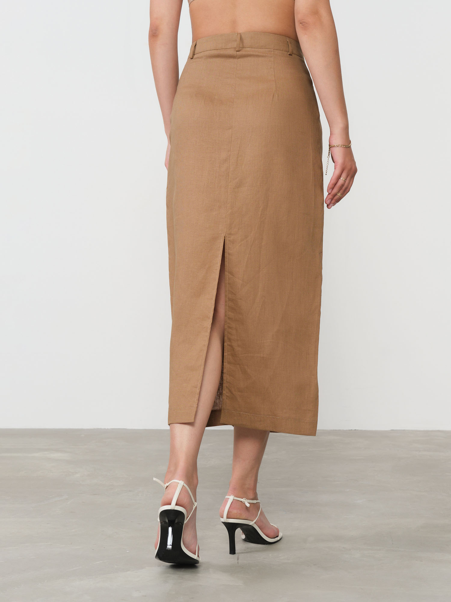 Пояс с аккуратной посадкой, шлёвки, задний разрез для свободы движения, чистые швы, натуральная текстура ткани.
