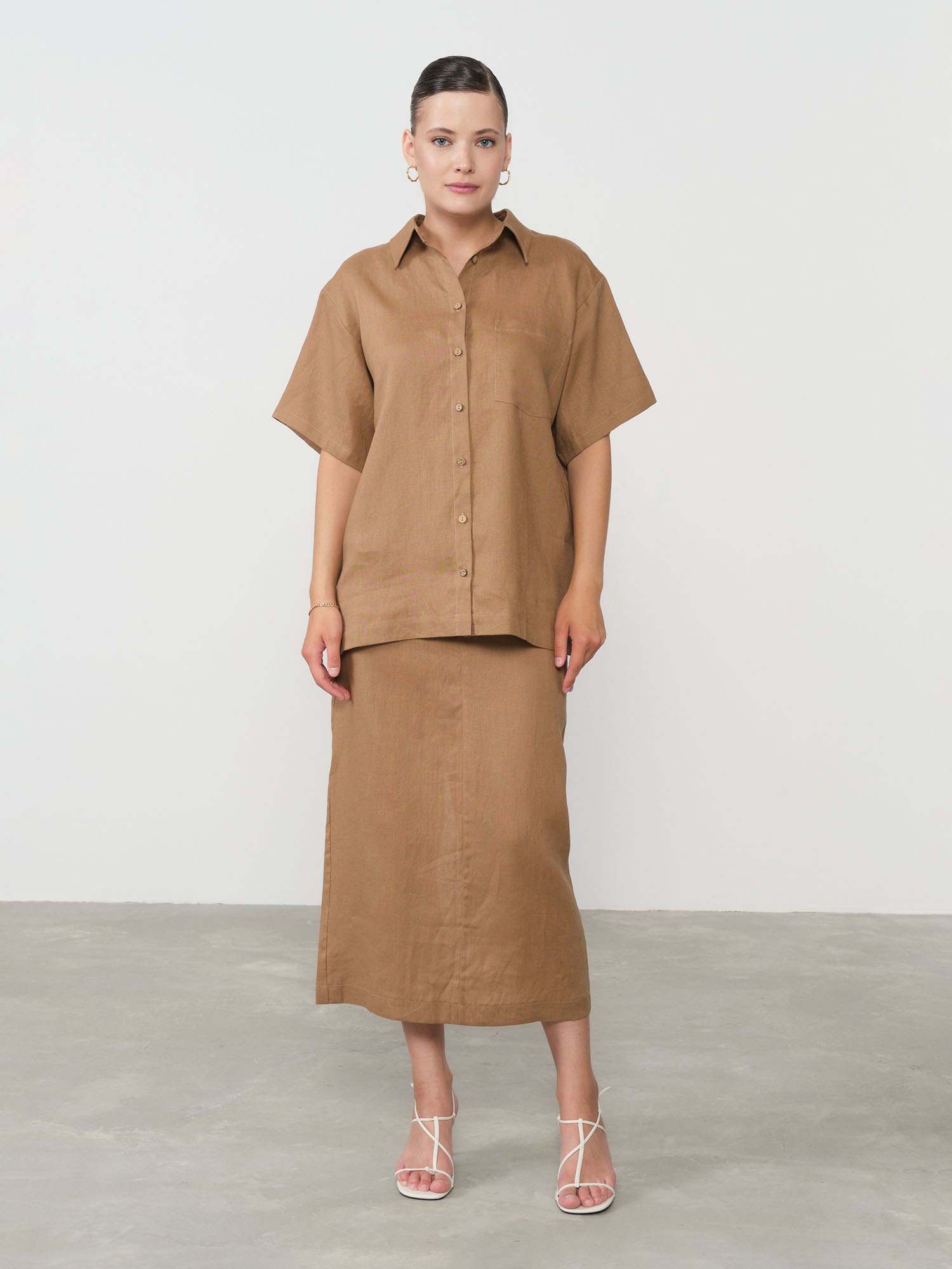 Идеально сочетается с топами, блузами и жакетами из льна. Подходит для повседневных, офисных и летних образов.