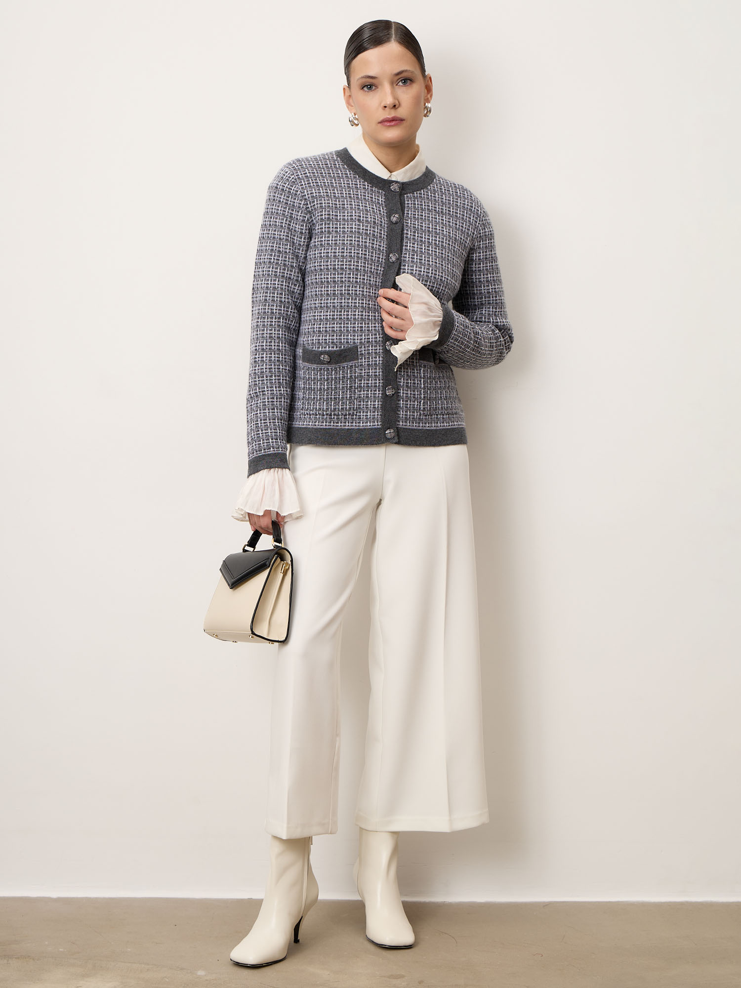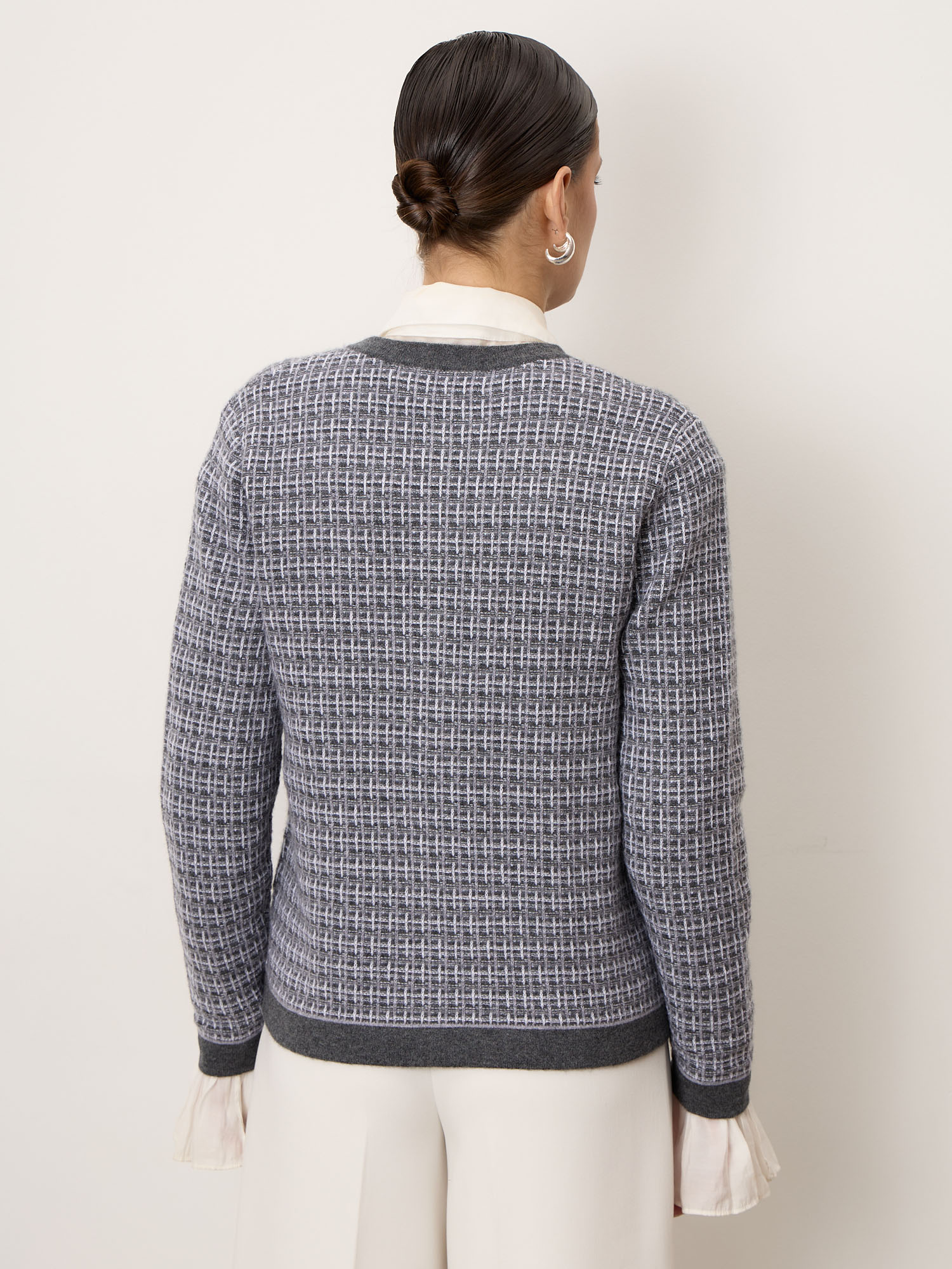 Премиальный кардиган из 100% монгольского кашемира в изысканном сером оттенке. Фактурная вязка и контрастная отделка создают элегантный, современные силуэт. Мягкий, тёплый и гипоаллергенный, он идеально подходит как для офиса, так и для повседневного стиля.