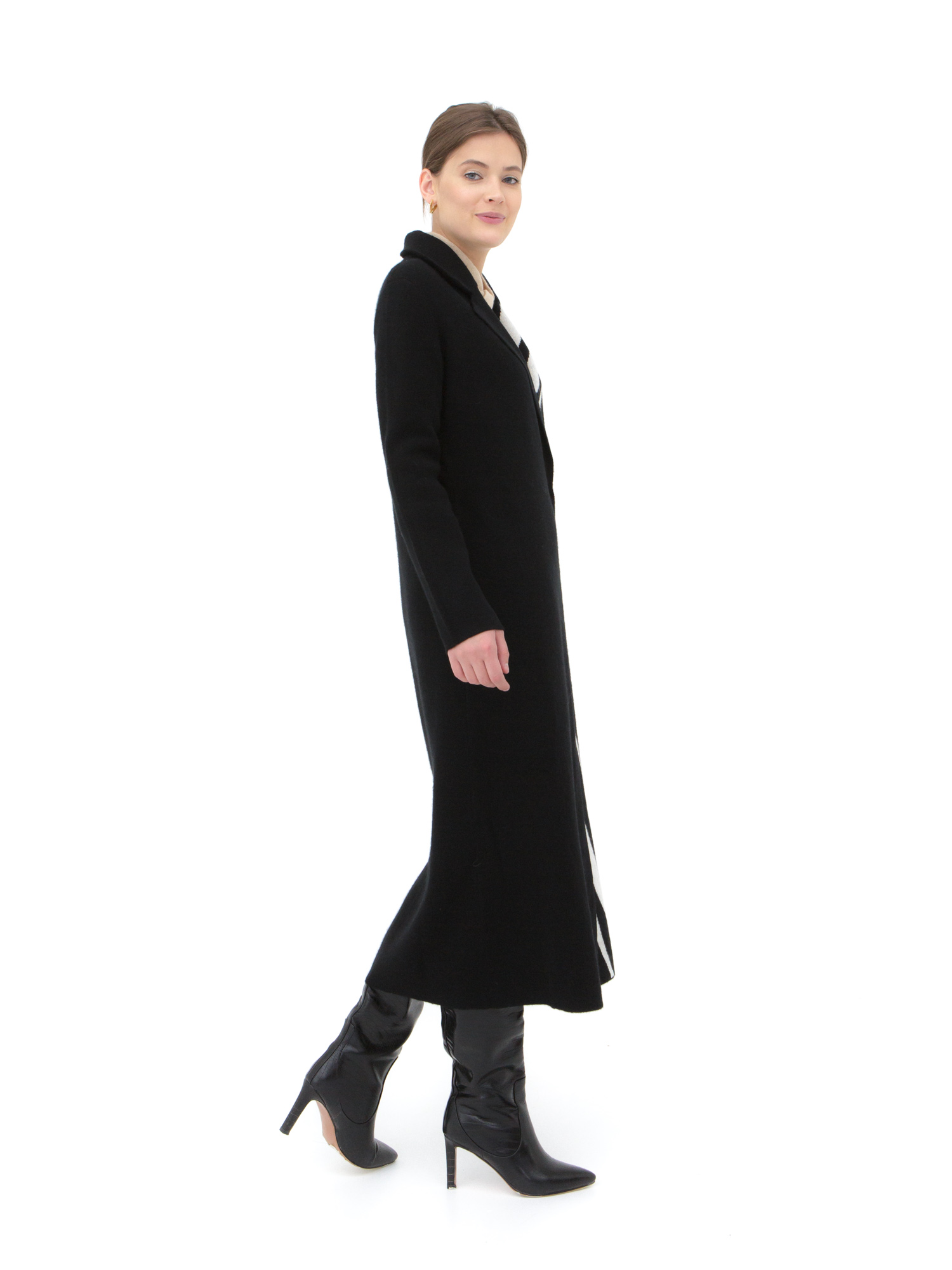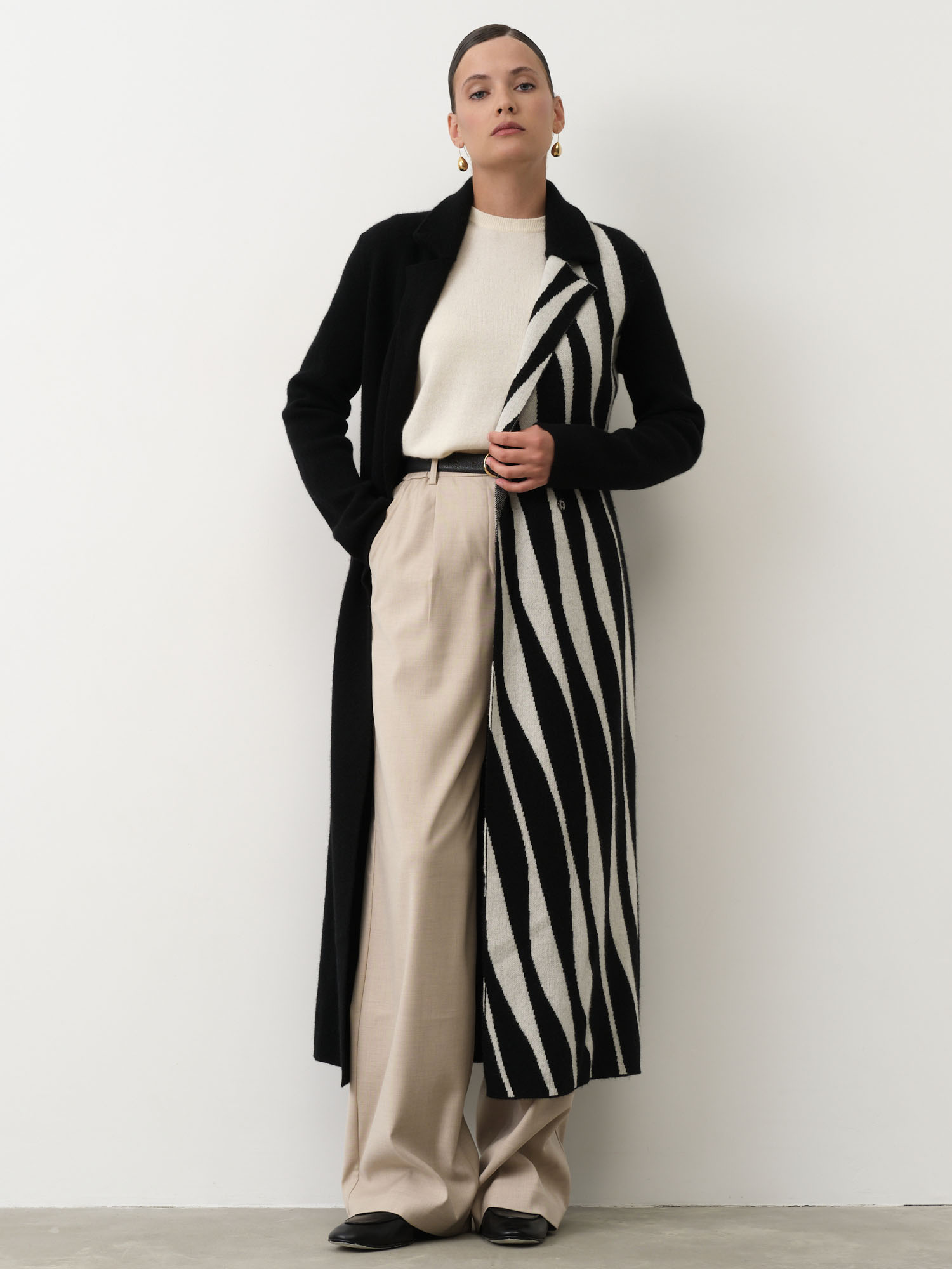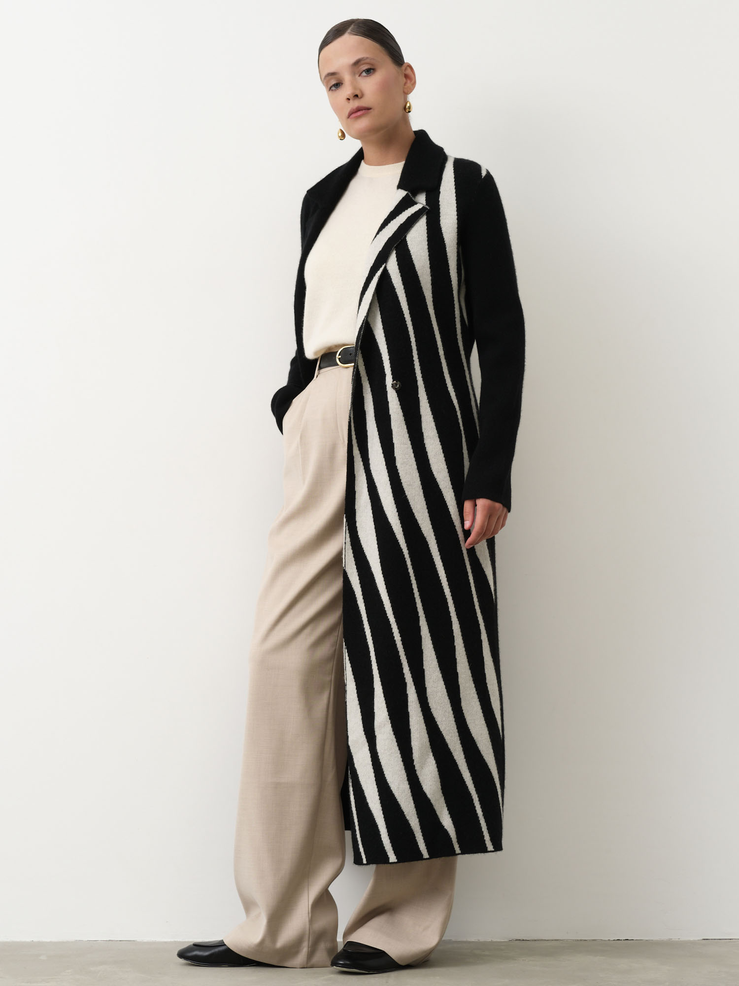 Элегантный удлинённый кардиган, сочетающий в себе благородство кашемира и тепло пуха яка. Модель выполнена в чёрном цвете с контрастным графичным узором, который придаёт образу выразительность и современный характер. Идеально подходит для многослойных образов и акцентных выходов.