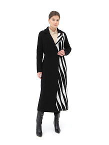Контрастная вставка с графическим узором, лаконичный воротник, аккуратная линия плеч и чистая обработка краёв. Минимализм в сочетании с выразительным принтом.